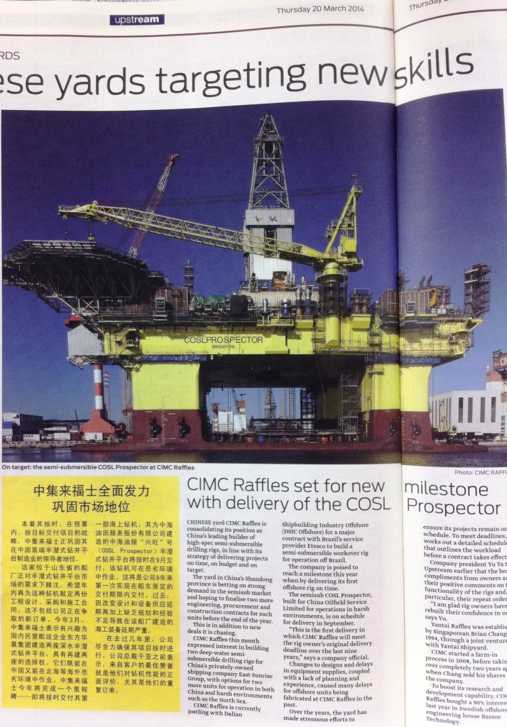 CIPPE 2014展會第二天,海工主流媒體Upstream的CIPPE特刊以“中集來福士全面發力鞏固市場地位”對中集來福士進行整版報道。