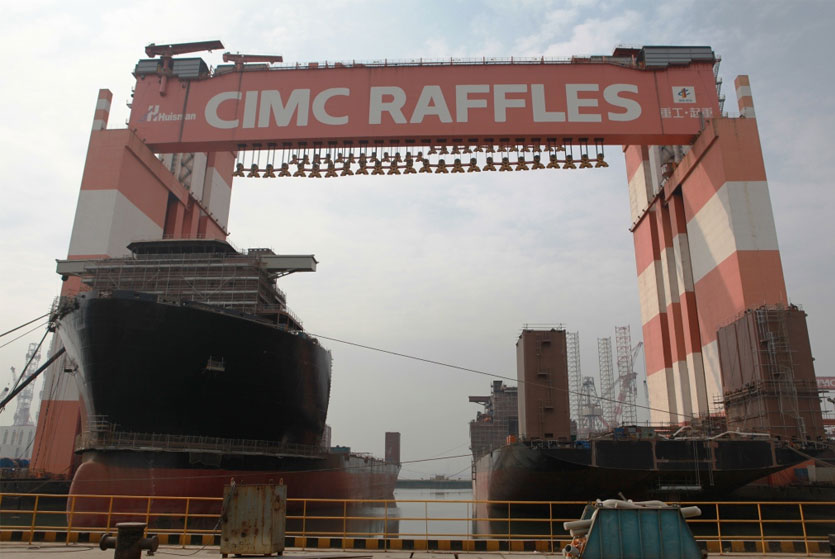 中集來(lái)福士建造的2艘5萬(wàn)噸半潛運(yùn)輸船同時(shí)在煙臺(tái)基地的大船塢進(jìn)行合攏,2014年3月21日,2艘半潛運(yùn)輸船完成合攏同時(shí)出塢。
