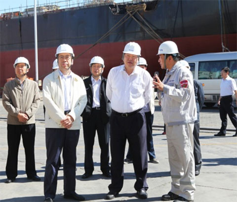 2014年9月24日上午,山東省委第二批黨的群眾路線教育實踐活動赴煙臺市督導(dǎo)組組長、原副省長張建國在煙臺市委書記張江汀陪同下到中集來福士考察。