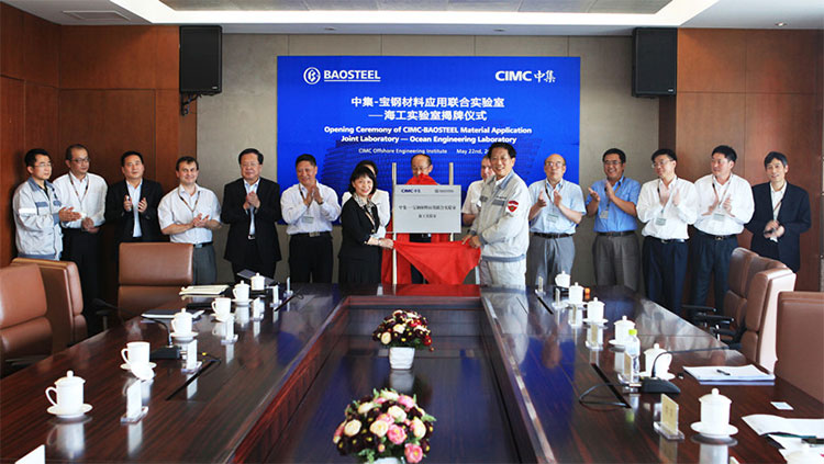 2015年5月22日,中集—寶鋼材料應用聯(lián)合實驗室揭牌儀式在煙臺中集海洋工程研究院舉行。山東省科技廳副廳長于書良、煙臺市副市長張廣波、烏克蘭國家科學院合作局局長SERGIY MYAKUSHKO 、寶鋼股份副總經(jīng)理王靜、中集來福士總裁于亞等參加了揭牌儀式。