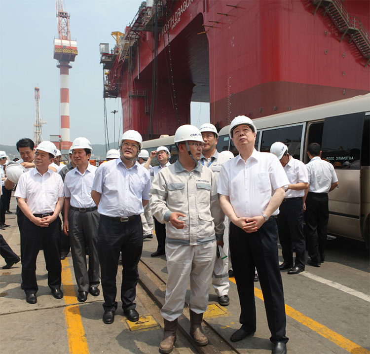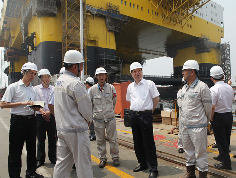 姜異康首先參觀了公司展廳,聽取了公司副總裁姜雋關于中集來福士廠區建設、在建項目以及中海油服興旺號、D90超深水半潛平臺等介紹。在深水碼頭,姜異康現場察看了GM4D深水半潛式鉆井平臺、D90超深水半潛鉆井平臺建造情況,并詳細聽取了項目負責人關于項目的技術參數、作業性能及建造進度的匯報。