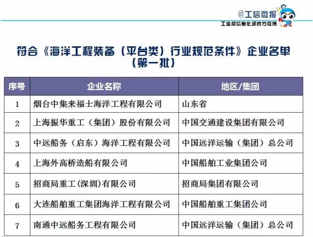 按照《海洋工程裝備(平臺類)行業規范條件》,根據企業申報,經省級船舶工業行業主管部門和中央企業集團(公司)初審,中國國際工程咨詢公司和中國船級社組織專家評審和現場核查,網上公示和審核等程序,現將符合《海洋工程裝備(平臺類)行業規范條件》的企業名單(第一批)予以公告。