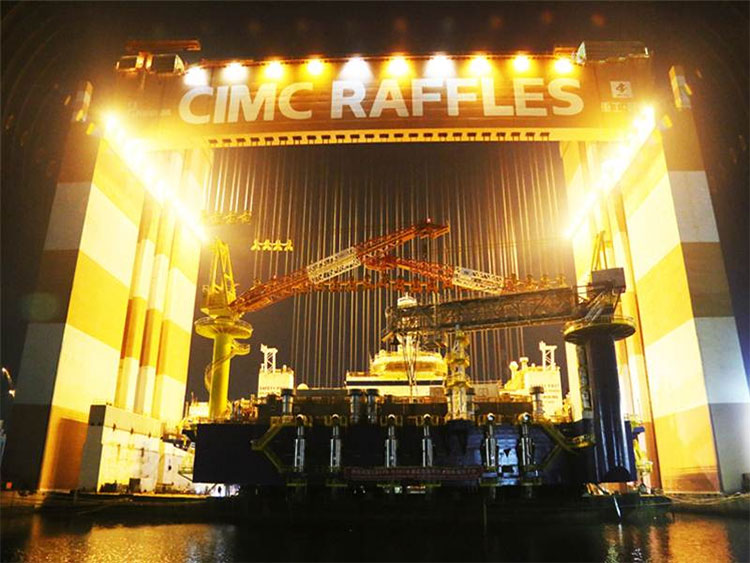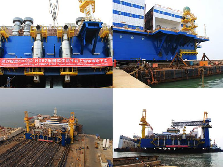 2016年9月14日早上6時40分,由中集來福士自主研發設計建造的半潛式生活平臺CR600上船體在海陽基地開始下水滑移,12時08分成功滑移到“德浮”2號駁船。歷時5小時,CR600項目上船體順利下水。