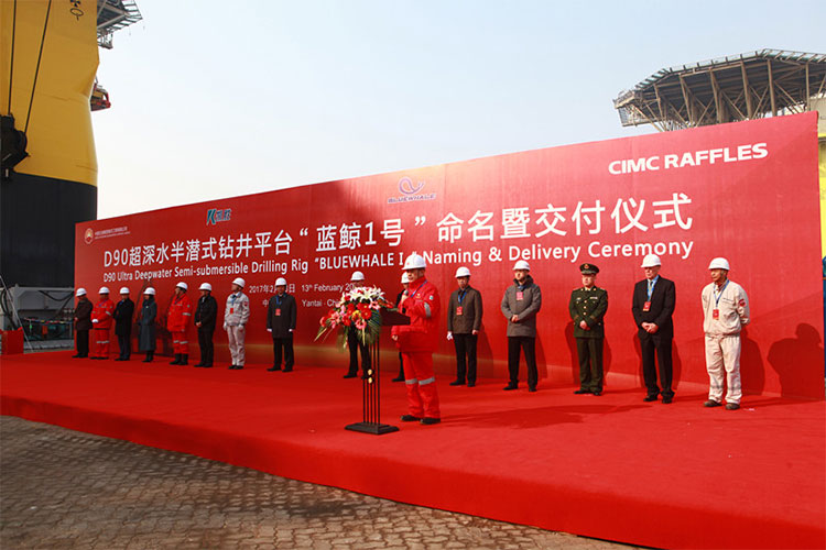 2017年2月13日,煙臺中集來福士海洋工程有限公司(簡稱“中集來福士”)建造的全球最先進超深水雙鉆塔半潛式鉆井平臺“藍鯨1號”在煙臺命名交付,這是中國船廠在海洋工程超深水領域的首個“交鑰匙”工程,具有里程碑意義。該平臺將由Bluewhale聯合中國石油集團海洋工程有限公司(簡稱“中油海”)共同履行服務合同,進行海洋能源勘探。