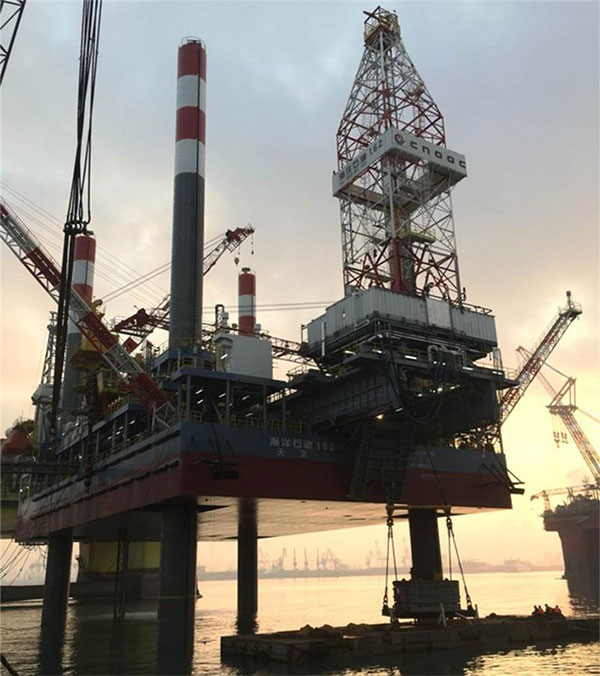 2017年2月13日下午16點55分,中集來福士建造的國內首座移動式試采平臺海洋石油162在煙臺基地順利完成懸臂梁負荷試驗,最大滿負載提升載荷158T。