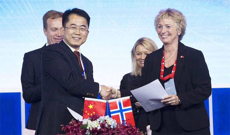 峰會上,中集來福士總裁王建中與挪威Ocean Aquafarms AS公司董事長Heidi Baugstø簽署了《挪威深海網箱建造意向書及針對中挪區域水產合作戰略協議》,涉及5座Hex Box養殖網箱建造,潛在價值高達2.5億美元。挪威首相索爾貝格及全國政協副主席王欽敏共同見證了協議簽署過程。