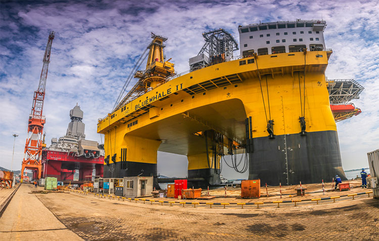 2017年7月29日下午,汽笛聲聲貫穿萬里晴空,藍(lán)鯨2號半潛式鉆井平臺伴著拖輪的牽引,緩緩的離開了中集來福士深水碼頭。