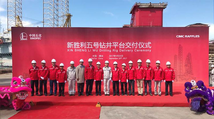 2017年9月20日上午,中集來福士煙臺基地一號碼頭鑼鼓陣陣、彩旗飄揚。中集來福士為中石化總裝建造的新勝利五號自升式鉆井平臺順利舉行交付儀式。中石化石油工程技術服務有限公司副總經理左堯久、中石化集團公司發(fā)展計劃部副主任劉會友、中石化海洋工程有限公司韓來聚、中石化海洋石油工程有限公司海洋鉆井公司黨委書記、經理許軍富、中國船級社總部海工檢驗管理處處長朱琪、中集來福士總裁王建中、中集來福士副總裁趙暉等參加了此次儀式。