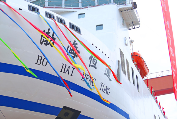 “渤海恒通”輪總長189.9米,型寬26.4米,上甲板高度15.4米,擁有3米寬度的車道約2700米,?3層車輛艙,設計吃水6米,續航力最大約5000海里,服務航速可達到17節,是目前亞洲最大的多用途滾裝船。該船為雙機、雙槳、尾機型的大型滾裝運輸船舶,其推進裝置采用2臺船用中速柴油機,分別通過減速齒輪箱及傳動軸系驅動可變螺距螺旋槳,是承載各類貨車、轎車及集裝箱的現代化節能環保型多用途滾裝船。配備艏側推、減搖鰭和防橫傾裝置,三甲板為全通甲板,艏艉上下車,配備艏跳板、艉直跳板、艉斜跳板、斜坡道和升降平臺;機艙設備采用國際品牌,配備2臺MAN主機,單臺最大功率4500kw。船舶配備先進的通導設備和動力設施;減搖鰭和減搖水艙提高了船舶抗風等級、船舶安全性和舒適性。船舶還專門配備了船員健身房,讓船員在工作之余,有更多休閑娛樂空間。該船將交付給由渤海輪渡與恒通物流股份有限公司、龍口港有限公司成立的渤海恒通輪渡有限公司,用于運營渤海灣及國內沿海滾裝運輸業務。