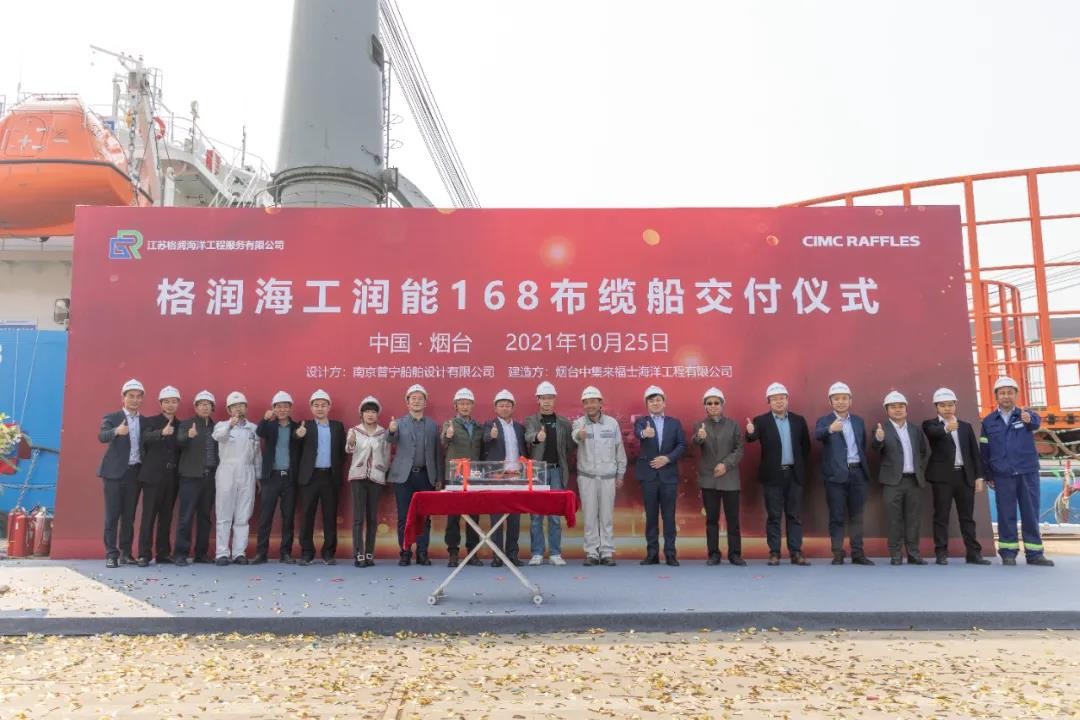 2021年10月25日上午,由南京普寧船舶設(shè)計(jì)有限公司承擔(dān)設(shè)計(jì),中集來福士海洋工程有限公司負(fù)責(zé)改造的江蘇格潤海洋公司服務(wù)有限公司“潤能168”布纜船在中集來福士煙臺建造基地完成交付。船東方江蘇格潤海洋公司服務(wù)有限公司和其母公司格潤國際控股代表,中國船級社煙臺辦事處、中集來福士等相關(guān)單位領(lǐng)導(dǎo)出席了本次儀式。